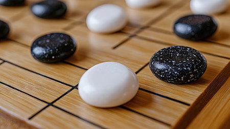A captivating image showcasing a Go game board with black and white stones laid out carefully, representing strategy, focus, and mental skill in a traditional setting.