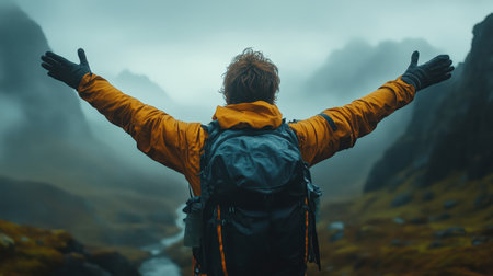 An adventurous explorer stands with arms wide open in a stunning mountainous landscape, symbolizing freedom and triumph. The atmosphere is misty, adding a sense of mystery and awesome.
