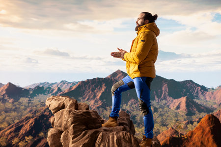 Alone traveler stands on a mountain summit soaking in the stunning view of peaks, clouds and endless sky, adventure seeker. Breathtaking scenery symbolizes determination and ambition.