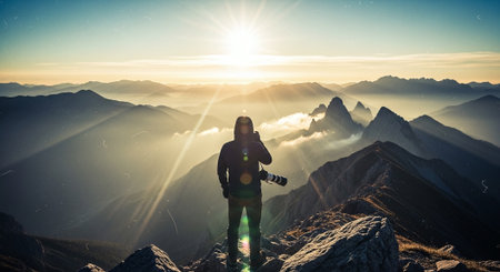 A climber reaching the peak of a mountain at dawn, embodying ambition and determination, with a landscape that balances earth and sky