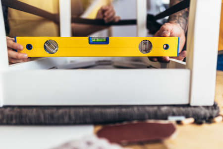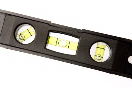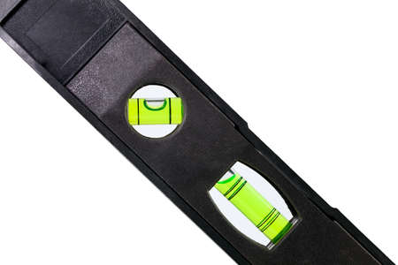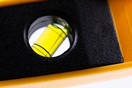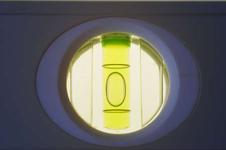 Close up of spirit level meter tool out of balance, motion, selective focusing.