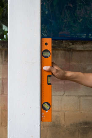 Asian maintenance worker man holding red aluminium spirit level tool or bubble levels at construction site. Equipment for civil engineering project
