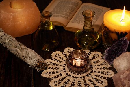 Esoteric still life with burning candle in yellow flame, open old book and crystals. Two green vials and dried sage on wooden table top.