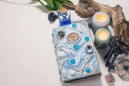White magic book laying on the table with old manuscripts with occult symbols, candles, lavender.