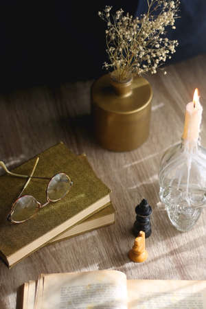Old books, reading glasses, vintage chess pieces, lit candle and vase with gypsophila flowers. Dark academia concept. Selective focus.