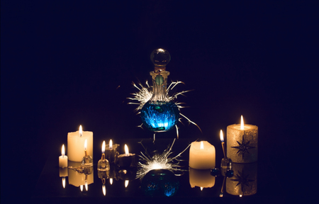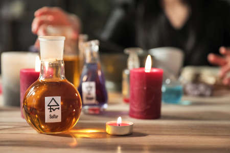 Potions and candles on alchemist's table