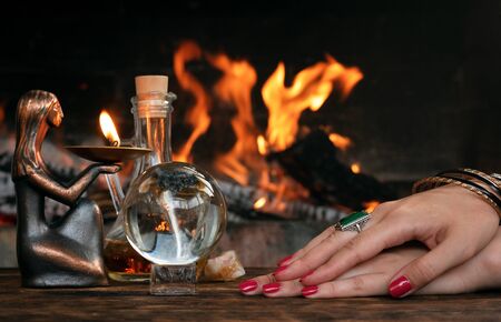 Fortuneteller's hands on a glass orb. Prediction of the future. Mystic interior. Occult symbols, runes stones, rosaries, candles