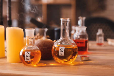 Flasks with potion and candles on table in alchemist's laboratory