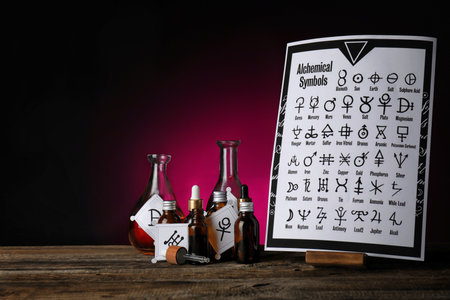 Potions with alchemical symbols on table