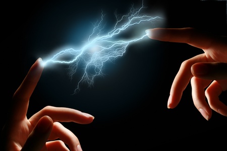 Hands and electric discharge over black background.
