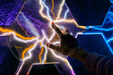 Interactive touchscreen exposition in science museum. Woman touching plasma panel display. Electricity, education, science, futuristic and physics concept