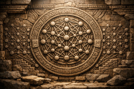 Carvings on stone depicting ancient mathematics concepts with geometric patterns. The tactile surface reveals details from a past civilization.