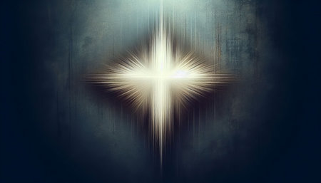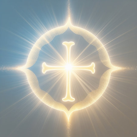 The image features a radiant cross symbol at the center, surrounded by an intricate, glowing design. The cross is encircled by a halo of light, with beams of light radiating outward in all directions. The background is a gradient of soft blue hues, enhancing the ethereal and serene atmosphere of the image. The overall composition conveys a sense of spirituality and divine light.