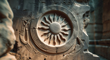 AI Generated. Ancient carvings depicting prominent sun symbol and intricate figures on a wall in a historical site