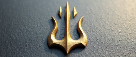 A striking golden trident emblem stands out against a textured gray background, capturing the light beautifully. This captivating design symbolizes power and strength, evoking a sense of authority and majesty.