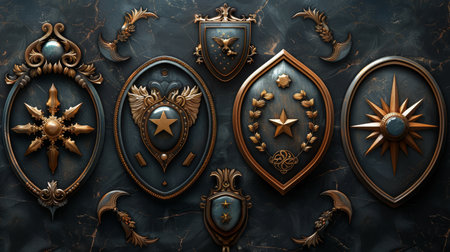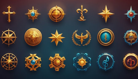 Golden and blue icons and symbols on dark background. Vector illustration.