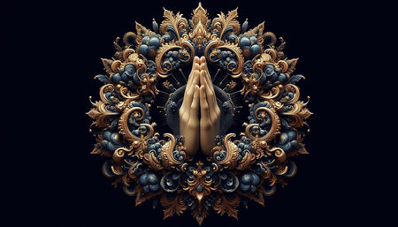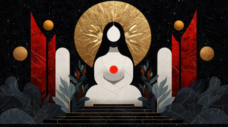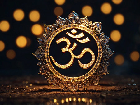 A visually striking composition featuring various spiritual symbols like the Om, flowers, and sacred objects set in a serene atmosphere, promoting tranquility and mindfulness.