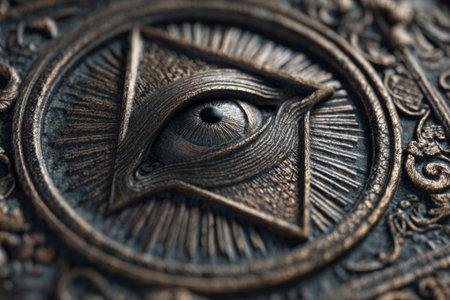 Close-up of eye of providence, a masonic symbol featuring an eye enclosed within a triangle, embossed on a metallic surface, representing concepts of god's watchfulness and spiritual enlightenment
