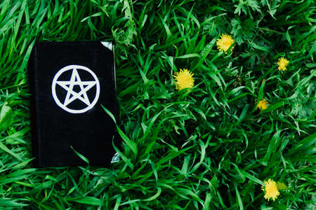Religious symbols on grass. Christianity, Islam, Judaism, Orthodoxy Buddhism and Hinduism. Interreligious or interfaith concept.