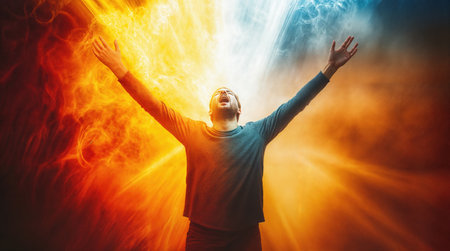 A man with arms outstretched, surrounded by glowing energy, symbolizing meditation, spiritual awakening, and inner peace.