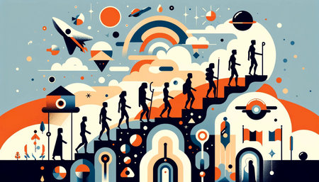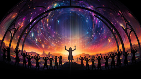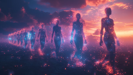 Silhouette of diverse models walking in a futuristic digital landscape, symbolizing evolution and connection in technology and human progress