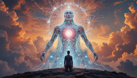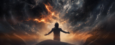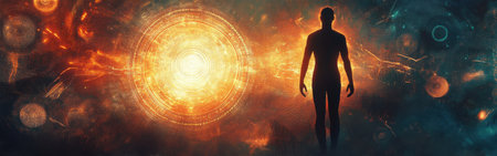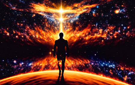 A man's silhouette emerges with a glowing core against a rich cosmic background. The mysterious surroundings evoke a sense of wonder and depth during twilight hours.