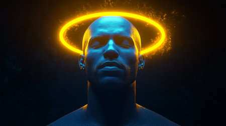 Man with a glowing halo in a dark setting, emphasizing a moment of introspection and tranquility