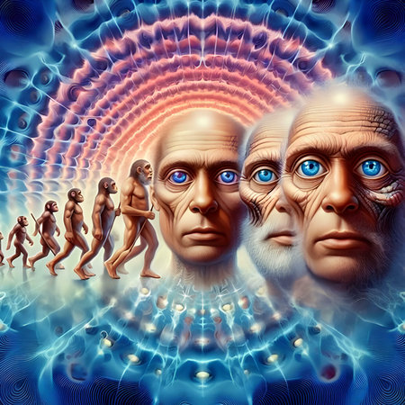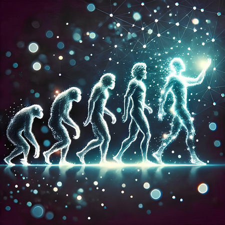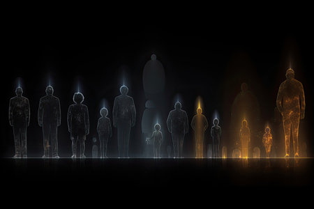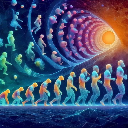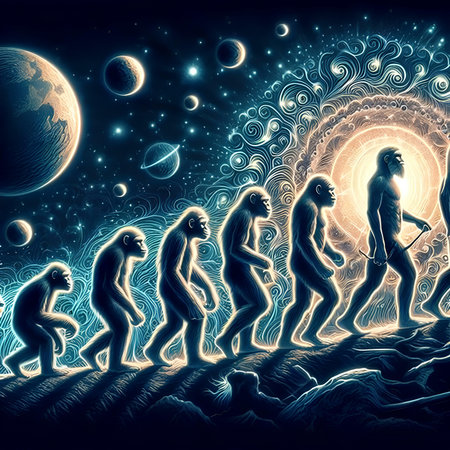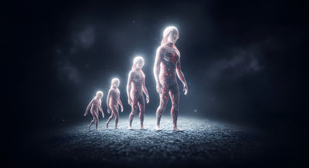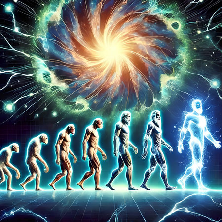 A conceptual image depicting four glowing, translucent humanoid figures walking in a line, showing stages of growth or evolution. The figures are walking on a dark, textured surface in a cosmic or abstract space, symbolizing development, AI, or human progression.