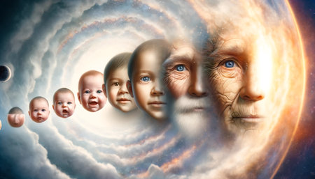 A series of faces, one of which is a baby, are shown in a spiral. The faces are arranged in a way that shows the progression of life, from infancy to old age. Concept of growth and change