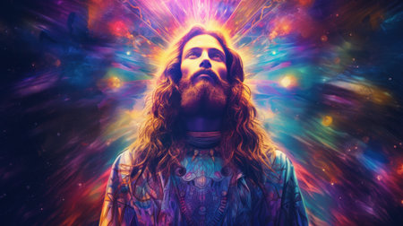 The man with long hair and a beard is standing in front of colorful lights, AI