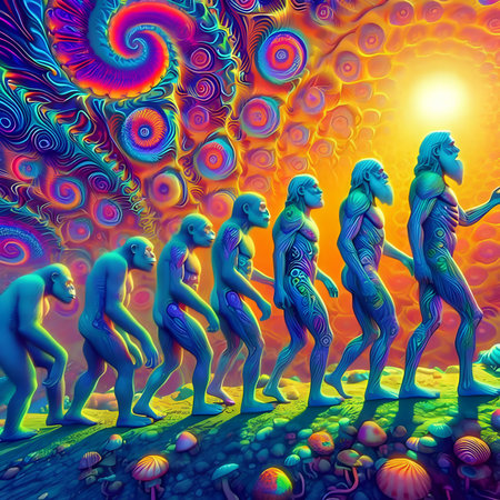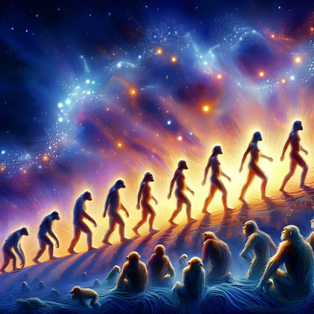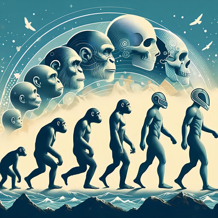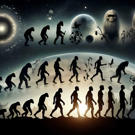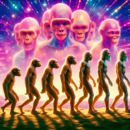 Human evolution concept as a group of monkeys following a pathogenic pathogen to the human body.