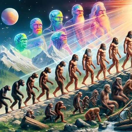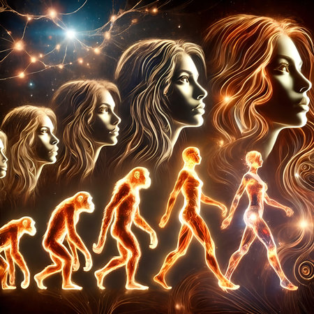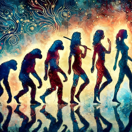 This captivating image depicts ethereal figures in a transition of motion, showcasing the interplay of light and shadow to evoke a sense of transformation and evolution.