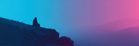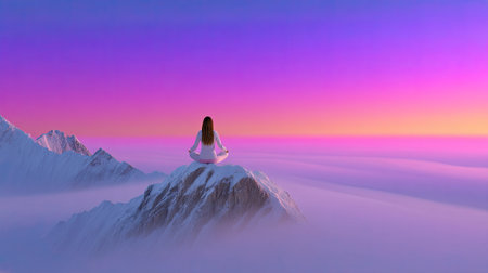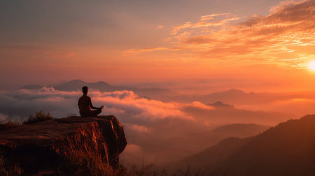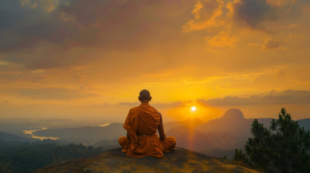 Monk meditating on a mountain at sunrise. Peaceful meditation with a scenic valley view. Concept of Buddhism, spirituality, mindfulness, peace, and dawn serenity.