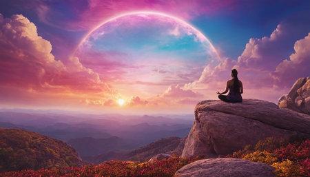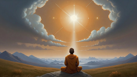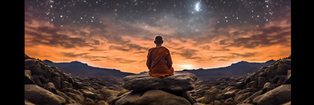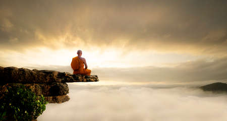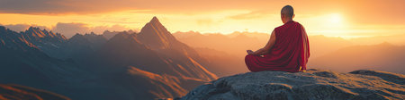 Buddhist monk meditating on mountain peak at sunset: finding inner peace