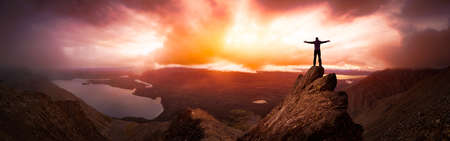 Magical Fantasy Adventure Composite of Man Hiking on top of a rocky mountain peak. Background Landscape from Yukon, Canada. Sunset or Sunrise Colorful Sky