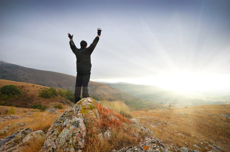 man on top of the mountain reaches for the sun