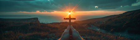 Four figures in sillhouette standing next to cross with sun rising in the background. Creative work and filming in nature concept.