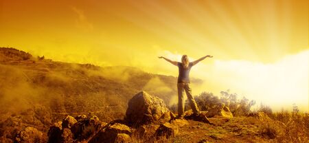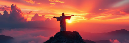 Jesus Christ on the top of a mountain at sunset. Panoramic banner