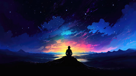 Silhouette of young female sitting practices yoga and meditating in lotus position alone on top of the mountain with night sky, star, Milky Way. She felt calm and happy.