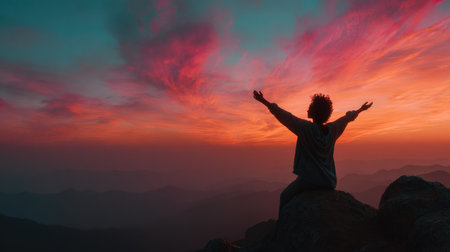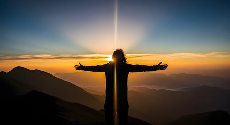A lone figure stands atop a mountain, arms outstretched, embracing the vast, majestic landscape below. Serenity and adventure intertwine.