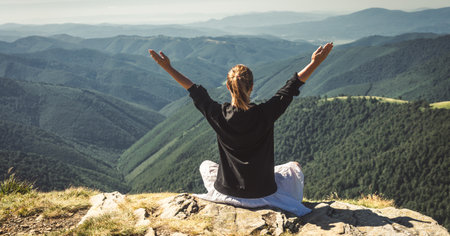 Woman meditates on boulder overlooking mountain forest and lake