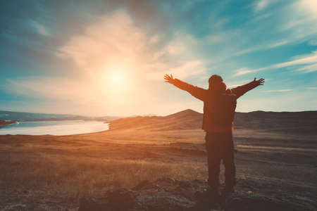 Traveler man wear red clothes and raising arm standing on mountain at daytime in Lake Baikal, Siberia, Russia.