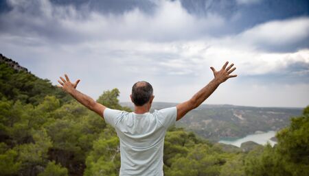 An aged happy man standing on top of a mountain with his arms outstretched. Beautiful view of the mountains and sky from the back of a man. The concept of freedom and happiness