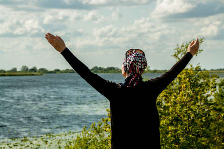 Woman raising his hands in worship. Christian Religion concept. Person on sunlight sky background. Christian female prayers to God in faith. Female raise hands in praise with faith and peace.