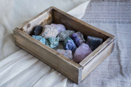 Multi-colored gems in a wooden box. Precious stones. collection of minerals. High quality photo