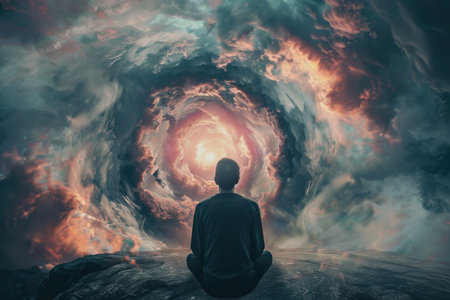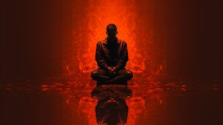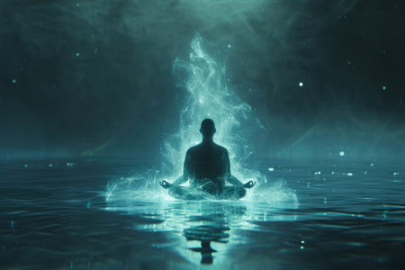 This stunning digital artwork captures a meditative silhouette surrounded by a radiant energy circle, creating a serene atmosphere perfect for themes of wellness and mindfulness.