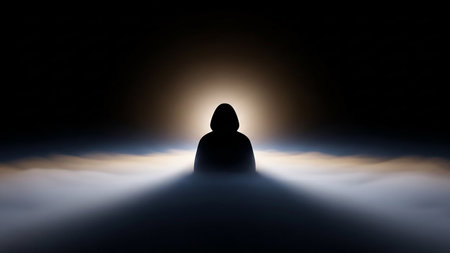 A silhouette of a hooded figure stands in a bright light emanating from behind. Clear details and vibrant colo...
