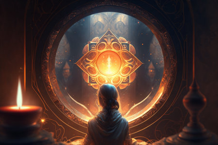 A serene moment of meditation with individuals gathered in focus around a luminous figure in a tranquil space.