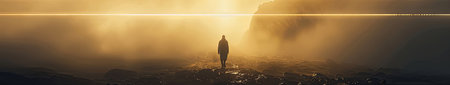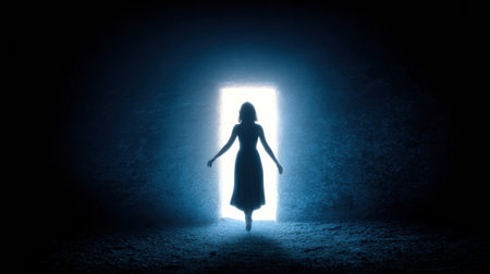 A silhouette emerges from deep shadows into bright light, representing a profound transformation and the path to self-awareness.