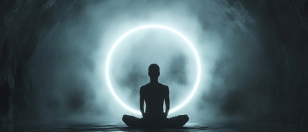 Silhouette of meditating person, concentric light rings creating a serene, tunnellike ambiance